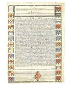 King John of England signs the Magna Carta. This document gave the people some rights and said the king was not above the law.